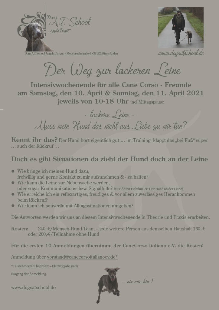 gabykropf März 17 1 Min. Zweitägiges Seminar Der Weg zur lockeren Leine !! Intensivwochenende für alle Cane Corso Freunde. Mehr unter Veranstaltungen